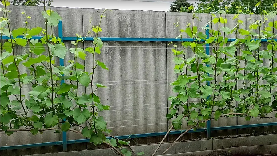 7. После всех возвратных заморозков убираем пленку. Подвязываем виноград на шпалере, причем рукава и плодовые лозы - горизонтально или полудугой, а зеленые побеги вертикально или под углом 45°, проводим окончательную обрезку лоз у последнего побега с соцветием.