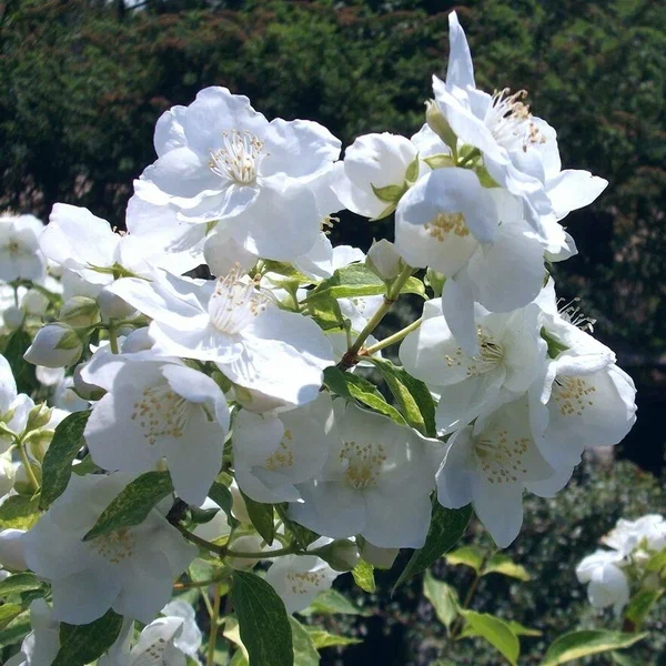 Компактный куст среднего (до 2 м высотой) размера с одиночными простыми, белыми, ароматными цветами. Листья местами имеют сливочно-белую пятнистость. Светолюбив, но может расти и в полутени. Морозостоек. К почвам не требователен, но не переносит застойного увлажнения и засоления. Выдерживает городские условия, газоустойчив. Используется как ординар, в группах, живых изгородях. Листья желто-пестрые, цветки простые, очень крупные.