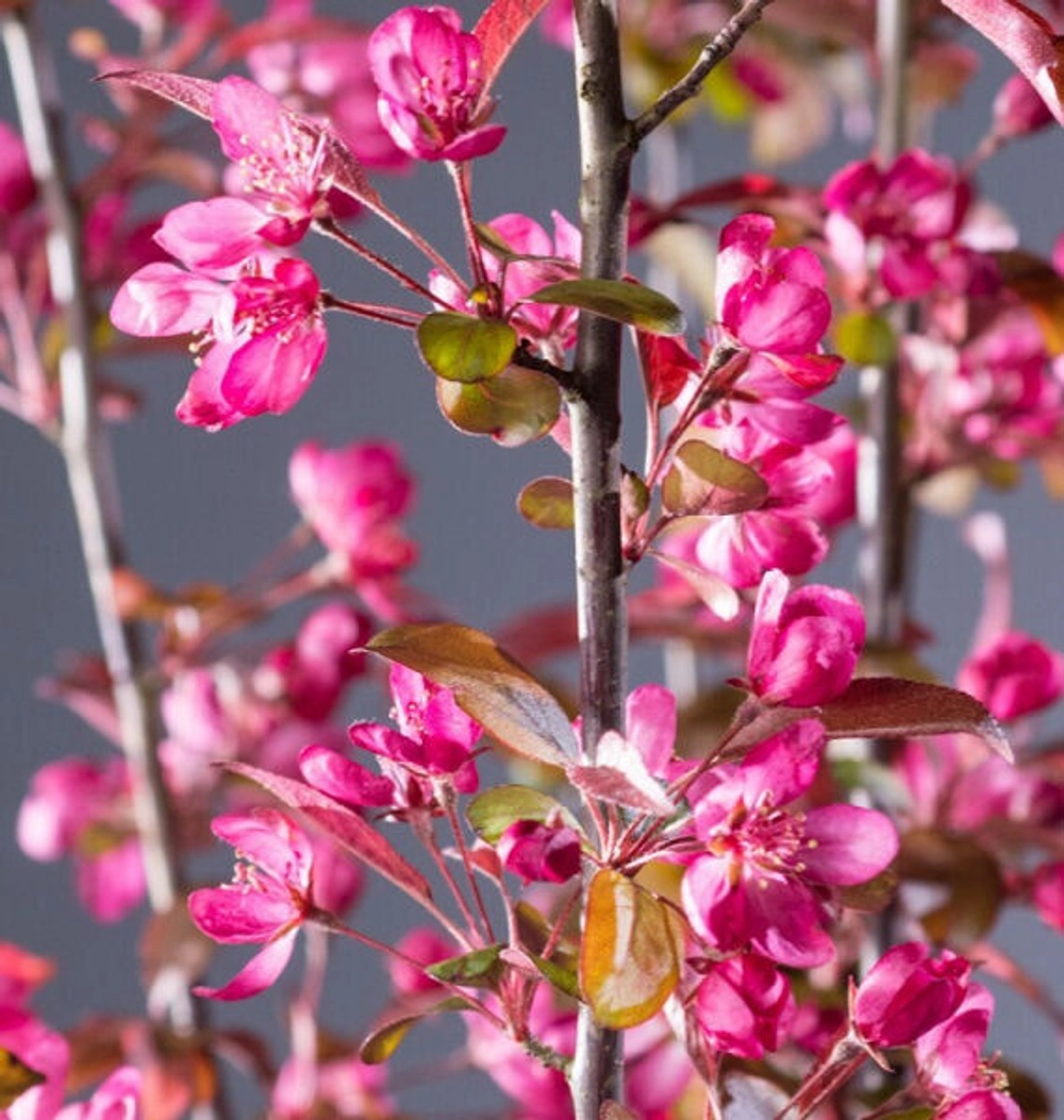 Новинка! Отличный сорт яблони декоративной. Цветки в бутонах темно-красные, после распускания темно-розовые, простые. Листья красные. Плоды очень мелкие, свекольно-красные.