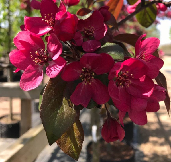Небольшое дерево. Высота 4 м, ширина 3 м. Декоративно все сезоны: ярко- розовые цветки хорошо контрастируют с глубоко лопастными, глянцевыми листьями (при распускании - ярко фиолетовыми, бронзово-зелеными летом и пурпурно - алыми осенью). Небольшие фиолетовые плоды долго остаются на дереве после опадения листьев.