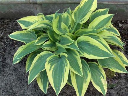 Среднего размера хоста. Листья копьевидные, сине-зелёные с красивой золотистой каймой. Цветки светло-лавандовые.