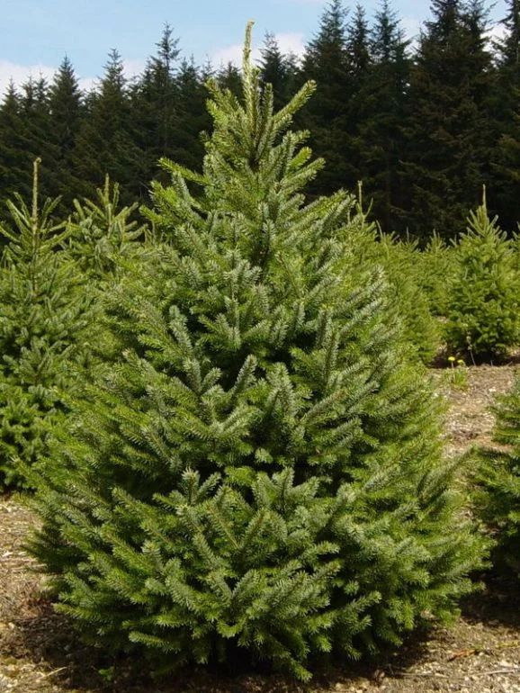 Мощное сильное дерево высотой 30–40 м и шириной 3–4 м, обладающее интенсивной скоростью роста. За один год прирост культуры может составлять 35–50 см в высоту и 15–25 см в ширину. Высота 30-летнего дерева — 10–15 м. Крона узко коническая, тонко заострённая, очень густая, с короткими ветвями. Боковые ветви часто дугообразно согнуты, мелкие побеги свисают. Старые деревья сохраняют нижний ярус ветвей при достаточном освещении. Хвоя двухцветная, сверху тёмно-зелёного цвета, с нижней стороны сине-белая.