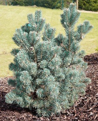 Карликовая форма. В начале- плушаровидная, с возрастом -коническая. Годовой прирост составляет 10 см. Иголки достаточно короткие, серо-голубые, уже на молодых растениях появляются шишки, которые рано опадают. Высота взрослого растения- 1-1,8м ( максимальная -до 2-3м). Хорошо растет на различных почвах, в молодости медленно. Светолюбива, но может переносить небольшое затенение, ветроустойчива. Зимостойкость очень высокая( до -45)